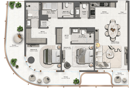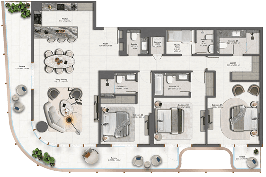 The community offers a calm beachfront lifestyle surrounded by landscaped parks, open promenades, and direct access to the sea, while remaining well connected to the city’s main hubs.