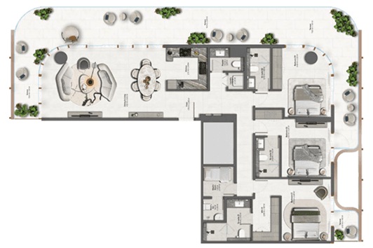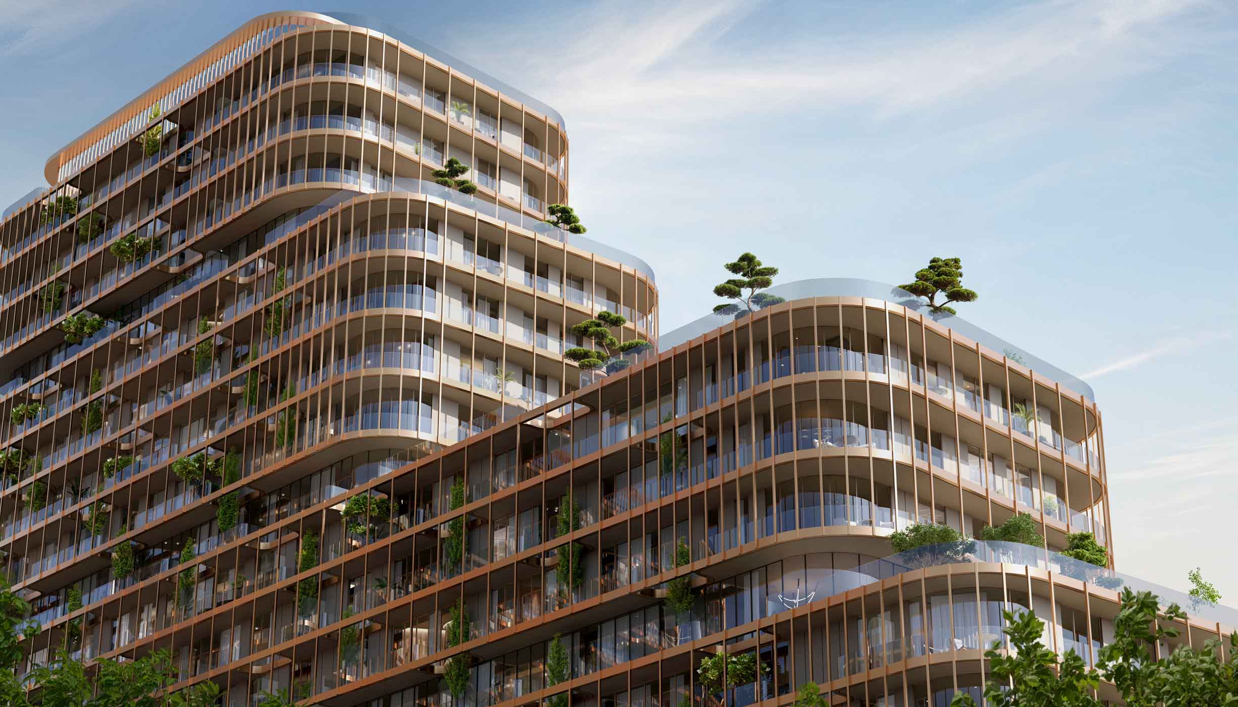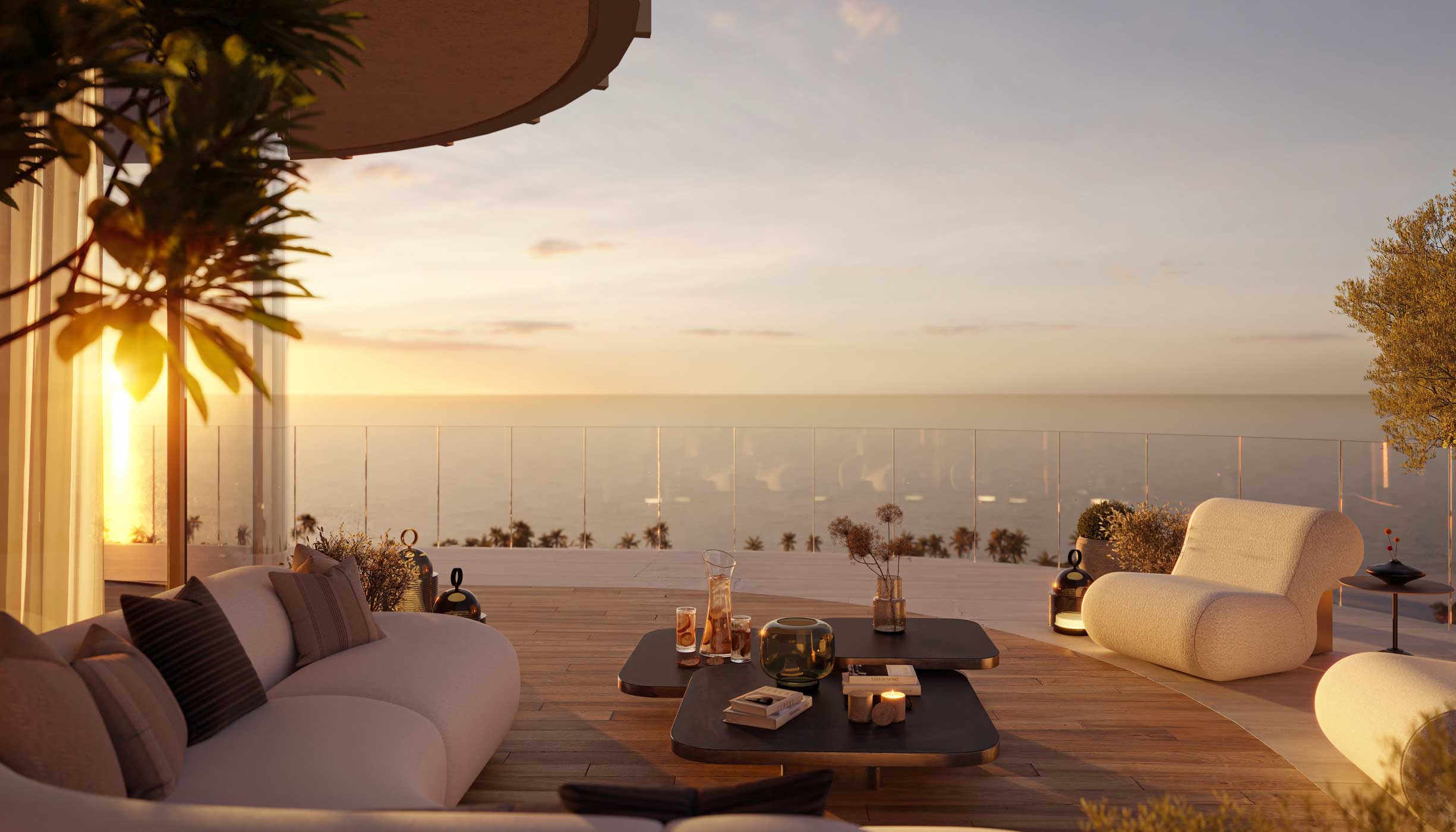 The development consists of three sculptural residential towers rising 21 floors, designed to maximise natural light, panoramic sea views, and a calm island lifestyle.